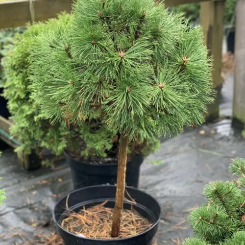 Сосна горная «Варелла» на штамбе - изысканная штамбовая форма популярного сорта горной сосны, представляющая собой пушистый шаровидный куст на ровном прямом стволе. Это растение ценится за декоративную густую крону с контрастной двухъярусной хвоей и эффектную архитектурную форму. Привитая на штамб высотой от 0,8 до 1,5 м, она формирует аккуратную сферическую или подушковидную крону диаметром до 1-1,2 м. Как и кустовая форма, «Варелла» отличается длинной (до 10-12 см), слегка скрученной тёмно-зелёной хвоей.