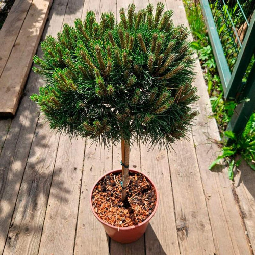 Сосна «Мари брегон» на штамбе (Pinus mugo 'Marie Bregeon' на штамбе) – популярный карликовый сорт сосны, который высоко ценится за миниатюрные размеры и идеальную шаровидную форму кроны. Это медленнорастущее хвойное растение, привитое на штамб высотой 0,4-0,6 м, достигающее во взрослом состоянии общей высоты 0,5-1 м при диаметре кроны 0,8-1,0 м, формируя плотную, симметричную шаровидную форму. Хвоя короткая (2-3 см), густая, ярко-зеленого цвета, собрана в плотные пучки. Годовой прирост составляет не более 3-5 см, что делает растение идеальным для малых садов.