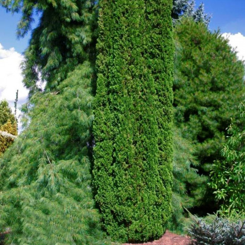 Туя западная Дегрут Спайр (Thuja occidentalis 'Degroot's Spire') — узкоколонновидный хвойный сорт, который ценится за уникальную спиралевидную форму ветвей и изумрудно-зеленую окраску хвои, сохраняющуюся круглый год. Это медленнорастущее дерево формирует чрезвычайно узкую, строго вертикальную крону, напоминающую остроконечный шпиль. Во взрослом состоянии достигает высоты 2,5–3 м при диаметре всего 0,6–0,8 м. Ветви короткие, плотно прижатые к стволу, закрученные по спирали, что создает изысканный рельефный рисунок поверхности. Хвоя чешуйчатая, мелкая, насыщенного темно-зеленого цвета летом и с легким бронзовым оттенком зимой. Главная декоративная особенность сорта — его архитектурная, скульптурная форма, которая придает ландшафту графичность и структуру даже в зимний период.