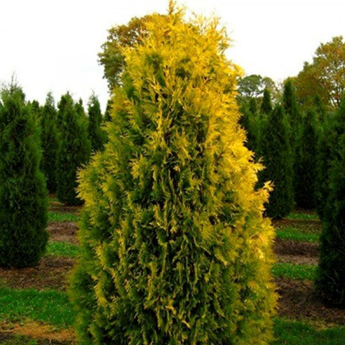 Туя западная Европа Голд (Thuja occidentalis 'Europe Gold') — популярный хвойный кустарник, который ценится за насыщенную золотисто-желтую окраску хвои, сохраняющую декоративность в течение всего года, и правильную коническую форму. Этот сорт образует плотную, симметричную крону с вертикально направленными ветвями. Скорость роста средняя, высота взрослого растения достигает 2–5 м при диаметре около 1 м. Хвоя чешуйчатая, весной и летом имеет яркий золотисто-желтый цвет, а зимой приобретает привлекательный медно-бронзовый оттенок, не теряя общей светлой тональности. Главная декоративная особенность сорта — стабильно яркая, «солнечная» окраска, которая делает растение эффектным цветовым акцентом в любом ландшафте даже в пасмурные дни.