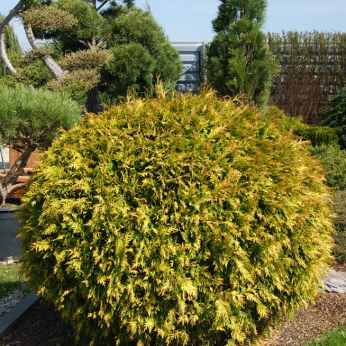 Западная Туя «Голден Глоб» - эффектный карликовый кустарник с шаровидной кроной, главной особенностью которого является яркая золотисто-желтая хвоя, сохраняющая декоративность круглый год. Этот медленнорастущий сорт отличается плотной, симметричной кроной, которая с возрастом приобретает идеальную шаровидную форму без дополнительной формировки. Хвоя чешуйчатого типа, мягкая на ощупь, весной и летом имеет насыщенный золотисто-желтый цвет, а осенью и зимой приобретает красивый медный оттенок, что делает растение настоящим украшением сада в любое время года.