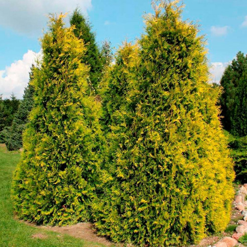 Туя западная Санкист (Thuja occidentalis 'Sunkist') — яркий хвойный кустарник, который ценится за насыщенную золотисто-желтую окраску хвои в течение всего года и изящную коническую форму. Этот сорт формирует плотную, симметричную крону высотой до 3–4 м и диаметром до 1,5 м с вертикально растущими, густыми ветвями. Хвоя чешуйчатая, мягкая, при распускании имеет яркий лимонно-желтый цвет, летом становится золотисто-желтой, а зимой приобретает эффектный бронзово-медный оттенок, особенно на кончиках побегов. Главная декоративная особенность сорта — стабильно яркая, «светящаяся» окраска, которая делает растение акцентным элементом в любом ландшафте даже в пасмурные дни. Растет медленно, ежегодный прирост составляет около 5–8 см.