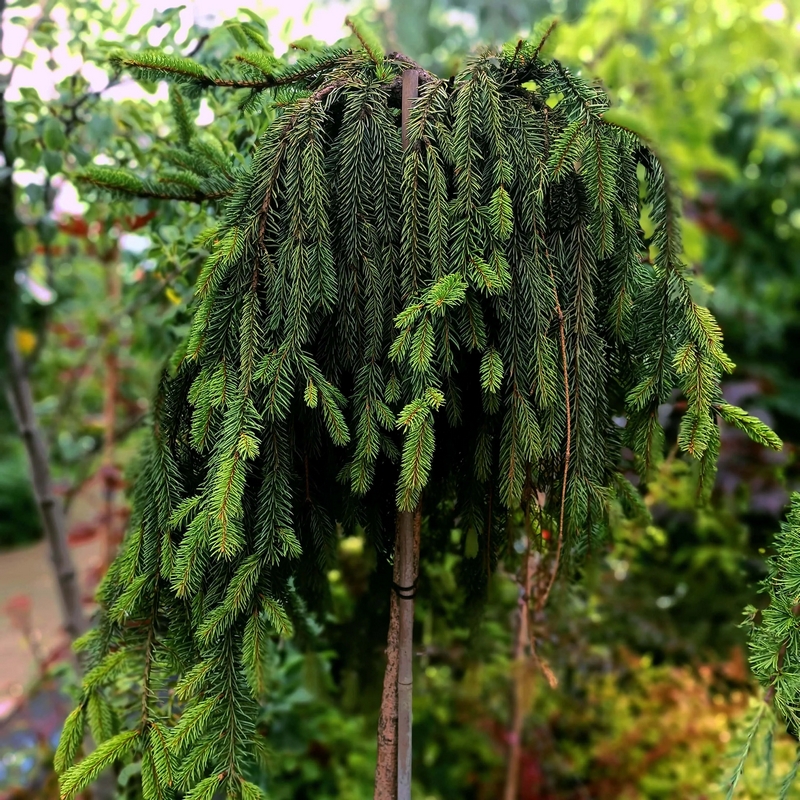 Ель «Инверса» на штамбе (Picea abies Inversa) – популярный декоративный сорт ели, который высоко ценится за уникальную плакучую форму кроны и живописный внешний вид. Это хвойное дерево, привитое на штамб высотой 1,5-2,5 м, достигающее во взрослом состоянии общей высоты 6-8 м при диаметре кроны 1,5-2,5 м, образуя выразительную колонновидную форму с ниспадающими вертикально вниз ветвями. Хвоя короткая (1-2 см), густая, темно-зеленого цвета, сохраняет насыщенную окраску в течение всего года. Ветви гибкие, свисающие плотным каскадом, требуют формирования для создания желаемой формы.