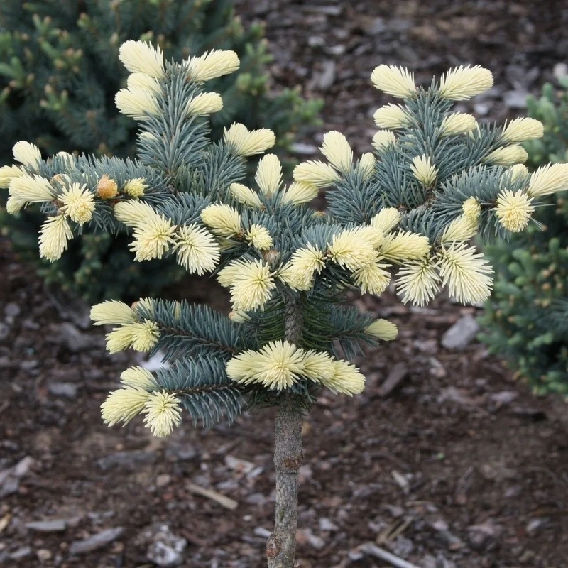 Ель колючая "Биалобок" - низкорослое хвойное дерево. Взрослое дерево к 30-ти годам достигает до 5 метров в высоту и около 2 метров в ширину. Растет очень медленно, годовой прирост всего 5-10 см. Крона ширококоническая, густая. Молодое дерево растет неправильной формы, без ярко-выраженного лидера. С годами ель выравнивается и приобретает классическую форму треугольника. Хвоя длинная и жесткая, голубого оттенка. Незрелые шишки зеленые, созревшие окрашиваются в красные тона. Самая главная отличительная черта - это белые приросты весной, которые украшают ель в течение двух недель.
