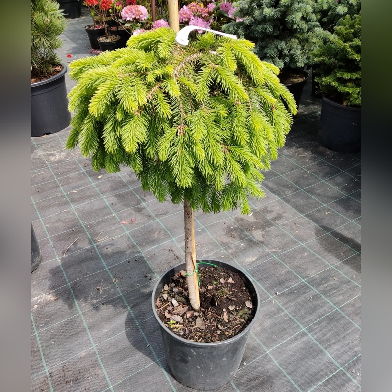 Ель обыкновенная "Форманёк" на штамбе (Picea abies «Formanek») - это необычное декоративное хвойное растение, представляющее собой штамбовую форму с плотной, стелющейся или слегка ниспадающей кроной. Густые, горизонтально расположенные ветви, покрыты мягкими иголками насыщенного зелёного цвета. Благодаря своей необычной форме ель на штамбе выглядит как зелёный зонтик или элегантный каскад. Шишки у этого сорта формируются крайне редко.