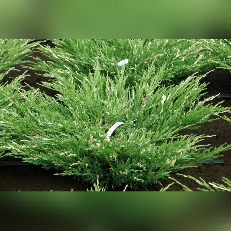Можжевельник горизонтальный «Вариегата» (Juniperus horizontalis Variegata) – популярный декоративный сорт можжевельника, который высоко ценится за пеструю окраску хвои и стелющуюся форму роста. Это вечнозеленый хвойный кустарник, достигающий во взрослом состоянии высоты до 100 см при диаметре кроны 1,5-2 м, образующий плотный, распростертый ковер с приподнятыми кончиками побегов. Хвоя чешуйчатая, зелено-голубого цвета с кремово-белыми пестрыми вкраплениями, которые распределены неравномерно по всему кусту. Зимой хвоя приобретает легкий сиреневатый оттенок, сохраняя пеструю окраску.