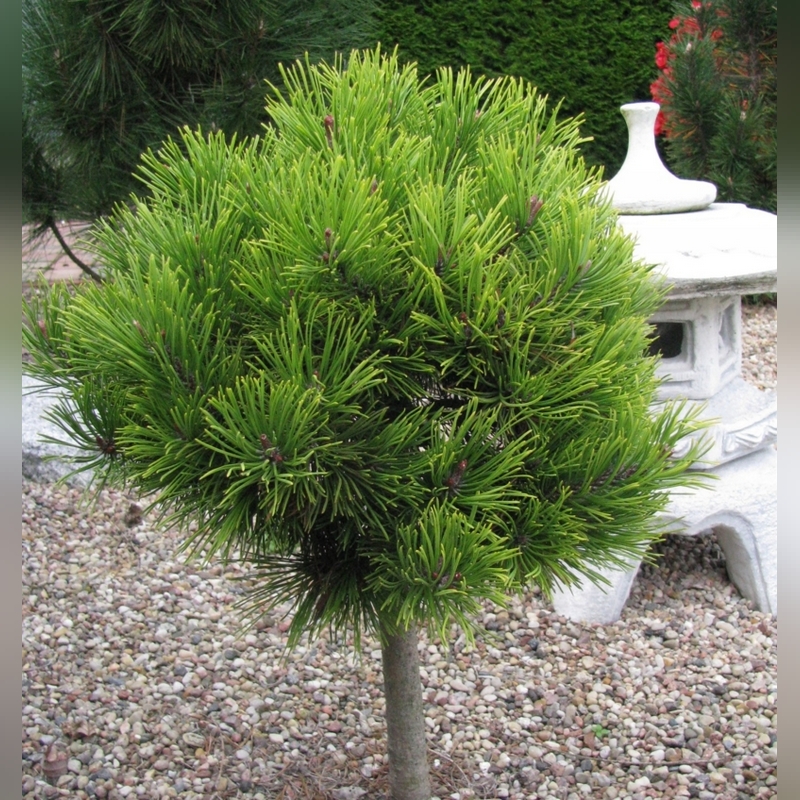 Сосна черная «Глобоза» на штамбе - высокодекоративная форма, представляющая собой густую, подушкообразную крону, привитую на ровный ствол-подвой. Этот прием позволяет получить эффектное миниатюрное «деревце» с идеально круглой или широко-зонтиковидной кроной, что ценится в ландшафтном дизайне для создания акцентов и придания структуры композиции. Высота растения зависит исключительно от высоты штамба и обычно составляет от 0,8 до 1,5 м, при этом диаметр плотной кроны может достигать 1-1,8 м. Хвоя длинная, жесткая, колючая, насыщенного темно-зеленого цвета, собрана по две хвоинки. Крона очень плотная, симметричная, с годами становится более уплощенной.