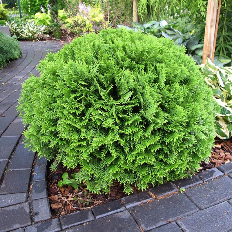 Туя западная Даника – миниатюрный хвойный кустарник с идеальной шаровидной формой кроны, покоряющий своей аккуратной декоративностью и неприхотливостью. Ее густая чешуйчатая хвоя насыщенного изумрудно-зеленого цвета сохраняет яркость круглый год, лишь слегка меняя оттенок на бронзовый в зимний период, чтобы весной вновь заиграть свежими зелеными красками. Компактные размеры этого сорта делают его идеальным выбором для небольших садов – взрослое растение достигает всего 50-60 см в высоту и около 1 м в диаметре, при этом растет крайне медленно, прибавляя не более 3-5 см в год, что позволяет долгие годы сохранять идеальную форму без специальной обрезки.