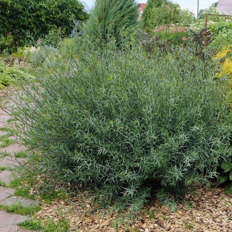 Ива пурпурная Нана - это компактное дерево, отличающееся изящной округлой кроной и тонкими, гибкими побегами с оригинальным пурпурным оттенком. В высоту растение обычно достигает 1,5 м, в ширину разрастается до 2-3 м, образуя плотный, шаровидный куст. Листья узкие, ланцетные, серебристо-зеленые с легким голубоватым оттенком. Осенью листва приобретает золотисто-желтый цвет. Цветет в апреле-мае, на побегах распускаются небольшие желтовато-серебристые сережки, привлекающие пчел и других насекомых-опылителей.