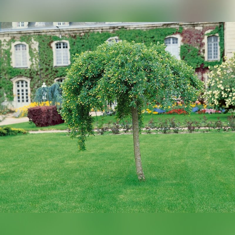 Карагана древовидная «Пендула» на штамбе - это необычное декоративное дерево, представляющее собой привитую форму обычной караганы древовидной. Взрослое дерево имеет невысокий штамб, на верхушке которого образуется длинная, свисающая вниз крона. Побеги тонкие, гибкие, поникающие, усыпанные мелкими сложными листьями светло-зелёного цвета, состоящими из небольших овальных листочков. Весной появляются ярко-жёлтые мотыльковые цветки, собранные в короткие кисти, которые равномерно распределяются по ниспадающим ветвям и придают растению нарядный, жизнерадостный вид. Плоды представляют собой небольшие бобы продолговатой формы, появляющиеся после цветения. Их вкус не имеет гастрономической ценности, собирают их чаще для получения семян, а не для кулинарных целей. Семена созревают в конце лета, их собирают по мере полного вызревания стручков.
