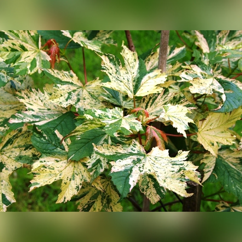 Клён «Низетти» на штамбе (Acer platanoides Nizetii) - это привлекательное декоративное дерево, которое отличается своей необычной вариегатной листвой и изящной формой. Этот сорт клёна прививается на определённую высоту ствола, что делает его компактным и удобным для использования в ландшафтных проектах, в небольших садах и на террасах. Штамбовый клён «Низетти» обычно имеет ствол высотой от 1,5 до 6 м, над которым формируется плотная, округлая крона. Диаметр кроны может достигать 4-6 м, что придаёт дереву сбалансированный и гармоничный вид. Листья этого клёна большие, пятилопастные, с вариегатной окраской: зелёные с кремово-жёлтыми или белыми пятнами и прожилками. Такая уникальная окраска сохраняется на протяжении всего сезона. Осенью листья приобретают золотистый оттенок. Цветение клёна происходит в мае, одновременно с распусканием листьев. Цветки небольшие, желтовато-зелёные, собраны в соцветия в виде щитков.