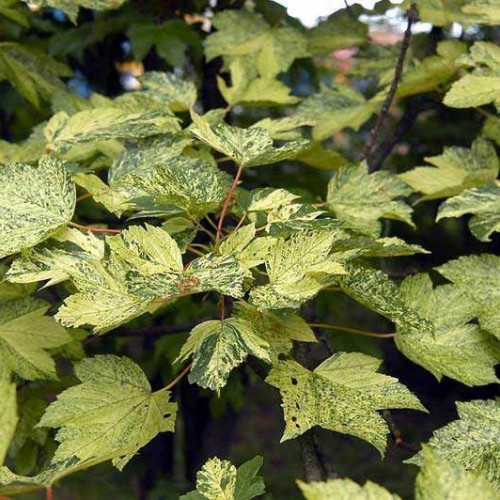 Клён «Леопольди» на штамбе (Acer platanoides 'Leopoldii') - это декоративное дерево, известное своей вариегатной листвой и элегантной формой. Этот сорт остролистного клёна прививается на ствол определенной высоты, что придаёт ему компактность и позволяет использовать в ландшафтном дизайне в качестве акцентного растения. Клён «Леопольд» на штамбе достигает от 1,5 до 15 м в высоту. Округлая, густая крона может достигать 4-6 м в ширину. Главная декоративная ценность этого дерева заключается в его ярко окрашенных листьях. Листья крупные, пятилопастные, зелёные с кремово-белыми или жёлтыми крапинками и пятнами. Эта вариегатная окраска сохраняется на протяжении всего сезона, что делает клён «Леопольд» особенно привлекательным с весны до осени. Осенью листья становятся жёлтыми. Цветение у клёна «Леопольд» на штамбе происходит весной, в мае. Цветки мелкие, жёлто-зелёные, собранные в щитковидные соцветия.