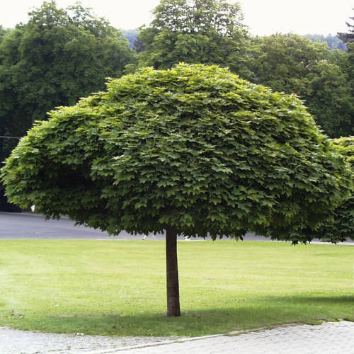 Клён остролистный «Глобозум» - небольшое дерево с выразительной округлой кроной, которая остаётся почти идеальной шарообразной даже при минимальном уходе. Взрослое дерево обычно не превышает 6-7 м в высоту, что делает его удобным для озеленения ограниченных пространств. Крона имеет плотную структуру, густо усыпанную ярко-зелёными пятилопастными листьями, которые весной и летом сохраняют сочный оттенок, а осенью приобретают насыщенный жёлтый цвет. Ствол относительно невысокий и ровный, кора у молодых деревьев гладкая, светло-коричневая, с возрастом покрывается неглубокими вертикальными бороздами. Цветки невзрачные, желтовато-зелёные, собранные в небольшие щитковидные соцветия, распускаются в начале весны. Плоды представлены парными крылатками, созревающими к концу лета. Вкус у них отсутствует, поскольку они не предназначены для еды. Семена собирают при полном созревании, если планируется размножение семенным способом.