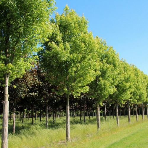 Клён «Пирамидалис» (Acer platanoides 'Pyramidale') - это декоративный сорт остролистного клёна, отличающийся своей узкой, колонновидной формой кроны и яркой зелёной листвой. Этот сорт часто используется в ландшафтном дизайне благодаря своей строгой форме и способности создавать акцентные вертикальные элементы в композициях. Дерево вырастает до 10-15 м в высоту и имеет узкую крону, ширина которой обычно не превышает 3-4 м. Листья у клёна «Пирамидалис» крупные, пятилопастные, с характерным ярко-зелёным цветом, который сохраняется на протяжении всего вегетационного периода. Осенью листва приобретает золотисто-жёлтую окраску, что придаёт дереву дополнительную декоративность. Цветение происходит весной, обычно в мае, до или одновременно с распусканием листьев. Цветки небольшие, жёлто-зелёные, собраны в щитковидные соцветия. Плоды клёна представлены крылатками - небольшими парными семенами с крыловидными выростами, которые при созревании становятся коричневыми. Вкус плодов не имеет значительной ценности, так как они не употребляются в пищу.