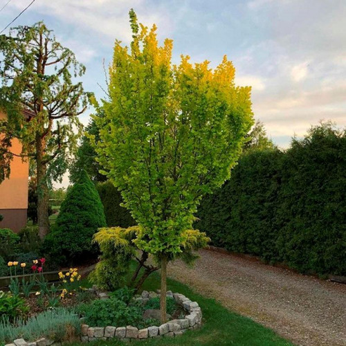 Вяз голландский «Вредеи» на штамбе (Ulmus × hollandica 'Wredei' on stem) – изысканное декоративное дерево, которое ценится за яркую золотистую листву и строгую пирамидальную форму. Это медленнорастущее листопадное дерево, привитое на штамб высотой 1,5-2,2 м, с компактной кроной диаметром 1-1,5 м. Листья широкояйцевидные, с зубчатым краем, весной ярко-золотисто-желтые, летом сохраняют насыщенный желто-зеленый цвет, а осенью приобретают нежный лимонно-желтый оттенок. Крона формируется плотной, узкоконической или яйцевидной, с вертикально растущими ветвями. Кора на штамбе серо-коричневая, с возрастом становится слегка трещиноватой.