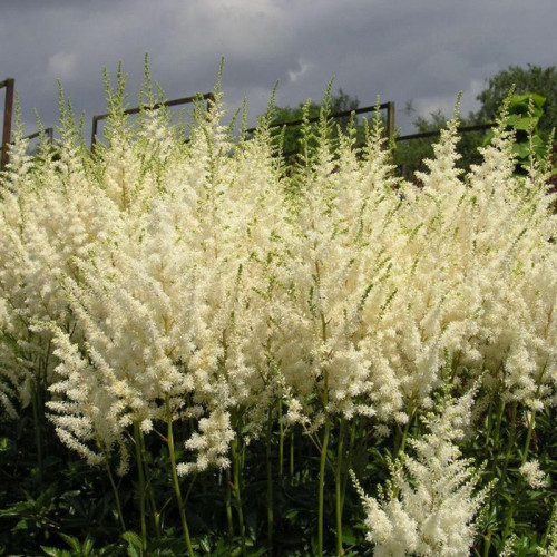 Астильба Арендса «Диамант» – популярный многолетний сорт астильбы, который высоко ценится за пышные белоснежные соцветия и теневыносливость. Это травянистое растение, достигающее во взрослом состоянии высоты 60-90 см при диаметре куста 50-60 см, формируя раскидистый, пышный куст с ажурной листвой. Листья крупные, дважды- или триждыперистые, темно-зеленые, блестящие, сохраняют декоративность в течение всего сезона. Соцветия плотные, ромбические, крупные (длиной 25-35 см), чисто-белого цвета, состоящие из многочисленных мелких цветков.