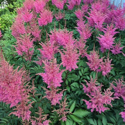 Астильба Арендса «Глория Пурпуреа» – популярный многолетний сорт астильбы, который высоко ценится за насыщенную окраску соцветий и выразительную контрастную листву. Это травянистое растение, достигающее во взрослом состоянии высоты 60 см при диаметре куста 50-60 см, формирующее раскидистый, пышный куст с ажурной листвой. Листья крупные, темно-зеленые с бронзовым оттенком, сложно-перистые, создающие эффектный фон для соцветий. Метелки плотные, ромбические, крупные (длиной 25-35 см), насыщенного пурпурно-розового цвета, пушистые, состоящие из многочисленных мелких цветков.