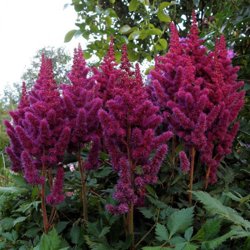 Астильба Арендса «Вижион Ин Ред» – популярный многолетний сорт астильбы, который высоко ценится за интенсивную окраску соцветий и компактную форму куста. Это травянистое растение, достигающее во взрослом состоянии высоты 40-50 см при диаметре куста 40-45 см, формирующее аккуратный, плотный куст с ажурной листвой. Листья темно-зеленые, с бронзовым оттенком, сложно-перистые, глянцевые. Соцветия плотные, пушистые, ромбической формы, насыщенного винно-красного цвета, сохраняют интенсивную окраску на протяжении всего периода цветения.