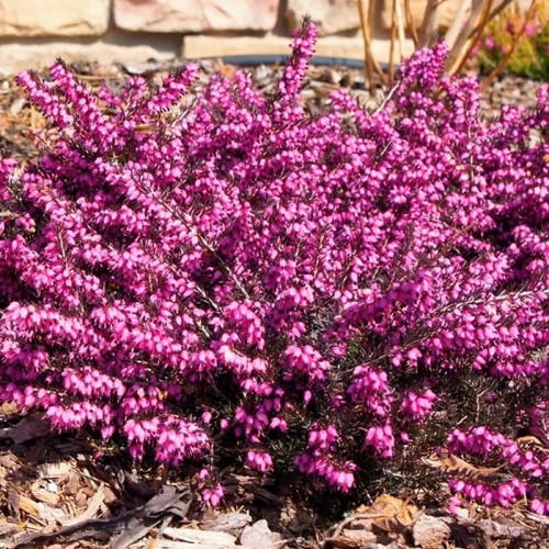 Эрика (Erica carnea) – популярный вечнозеленый кустарник, который высоко ценится за продолжительное зимне-весеннее цветение и способность расти на бедных почвах. Это почвопокровное растение, достигающее в высоту 15-25 см при диаметре куста 30-40 см, формирующее плотные, подушковидные куртины. Листья игольчатые, ярко-зеленые, длиной 4-8 мм, собраны в мутовки по 4. Цветки колокольчатые, многочисленные, окрашены в зависимости от сорта в белые, розовые, красные или пурпурные тона, собраны в односторонние кисти. Период цветения – с февраля по апрель, часто цветет даже при наличии снежного покрова.