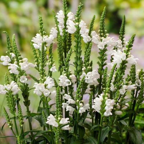 Физостегия виргинская белая (Physostegia virginiana 'Alba') – изящный многолетник, который ценится за стройные белоснежные соцветия и способность сохранять форму цветков. Это травянистое растение образует компактные кусты высотой 70-90 см с прямыми прочными стеблями. Листья ланцетные, темно-зеленые, с пильчатым краем, расположены супротивно. Главная особенность сорта – плотные колосовидные соцветия длиной 20-30 см, состоящие из многочисленных трубчато-колокольчатых цветков чисто-белого цвета. Уникальное свойство физостегии – способность цветков сохранять заданное положение при перемещении вдоль соцветия. Цветение продолжительное – с июля по сентябрь, длится 6-8 недель.