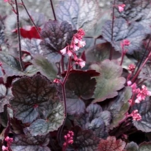 Гейхера «Регина» (Heuchera «Regina») - декоративное многолетнее растение, которое ценится садоводами за эффектную окраску листвы и продолжительное цветение. Растение представляет собой компактный, плотный куст высотой 30-35 см и диаметром около 35-40 см. Листья крупные, округлой формы, с зубчатыми краями и бархатистой текстурой. Окраска листьев меняется в зависимости от сезона и освещения - от серебристо-розового до насыщенного фиолетово-бордового оттенка с выраженными тёмными прожилками. В летний период гейхера выпускает тонкие высокие цветоносы с многочисленными мелкими розоватыми или светло-фиолетовыми цветками. Плоды гейхеры - небольшие коробочки с мелкими семенами, которые созревают к концу лета или осенью.