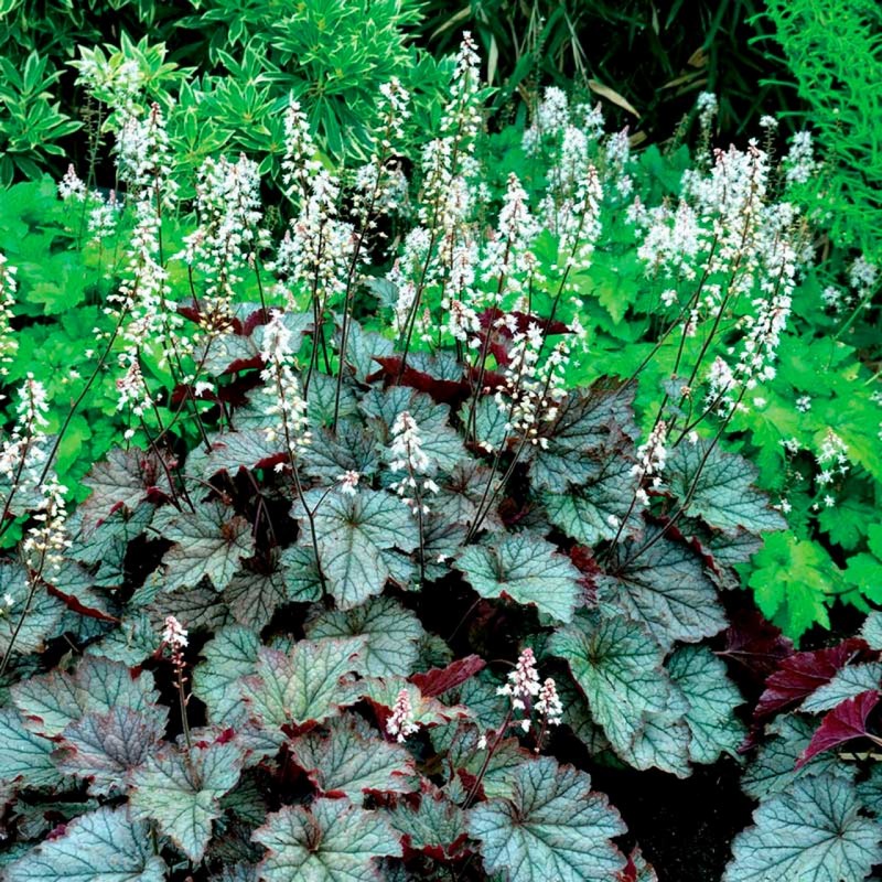 Гейхера «Твайлайт» (Twilight) - это декоративное многолетнее растение, известное своим красивым узором на листьях и насыщенной окраской. Листья имеют глубокий фиолетово-бордовый оттенок с металлическим блеском. На листьях видны серебристые прожилки, которые подчёркивают их форму и текстуру, создавая эффектное зрелище. Куст гейхеры «Твайлайт» формирует аккуратную розетку высотой 25-40 см.