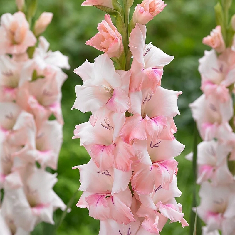 Гладиолус «Роуз Суприм» (Gladiolus Rose Supreme) – великолепный сорт гладиолуса, который ценится как за нежную розовую окраску плотных соцветий, так и за изысканную форму крупных цветков. Это многолетнее клубнелуковичное растение достигает высоты 120 см с прочным прямым стеблем. Листья мечевидные, темно-зеленые, длиной 60-70 см, образуют элегантный вертикальный веер. Главная особенность сорта – плотное колосовидное соцветие длиной 60-80 см с 18-22 бутонами, одновременно раскрывающими 8-10 цветков нежно-розового цвета с перламутровым отливом и более темным кораллово-розовым окаймлением по краям лепестков. Цветки крупные, диаметром 14-16 см, с сильногофрированными волнистыми лепестками. Цветение продолжительное, наступает в июле-августе и длится 2-3 недели.