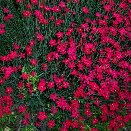 Гвоздика травянка «Бриллиант» (Dianthus deltoides 'Brilliant') – популярный почвопокровный многолетник, который высоко ценится за яркое продолжительное цветение и способность образовывать плотные декоративные ковры. Это многолетнее травянистое растение, достигающее в высоту 15-20 см при диаметре куста 25-30 см, образующее плотные, подушковидные куртины. Листья мелкие, узколанцетные, темно-зеленые с сизым оттенком. Цветки насыщенного малиново-красного цвета, диаметром 1,5-2 см, с контрастным более темным кольцом в центре и легким приятным ароматом. Цветение обильное и продолжительное – с июня по август.