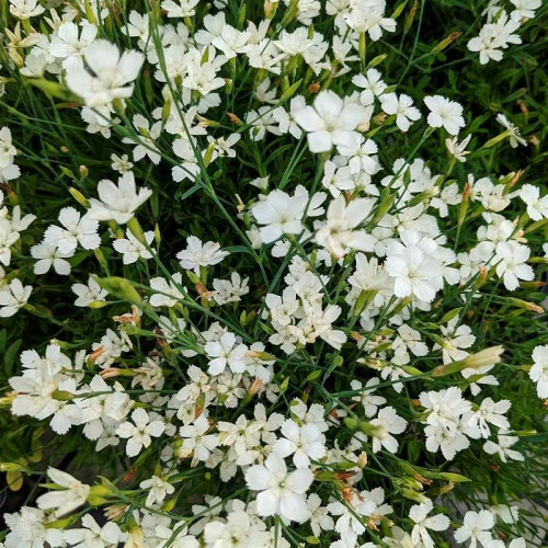 Гвоздика травянка «Альбус» (Dianthus deltoides 'Albus') – популярный почвопокровный многолетник, который высоко ценится за изысканные белоснежные цветки и способность образовывать плотные декоративные ковры. Это многолетнее травянистое растение, достигающее в высоту 15-20 см при диаметре куста 25-30 см, образующее плотные, подушковидные куртины. Листья мелкие, узколанцетные, темно-зеленые с сизым оттенком. Цветки чисто-белые, диаметром 1,5-2 см, с мелкозубчатыми лепестками и легким приятным ароматом. Цветение обильное и продолжительное – с июня по август.