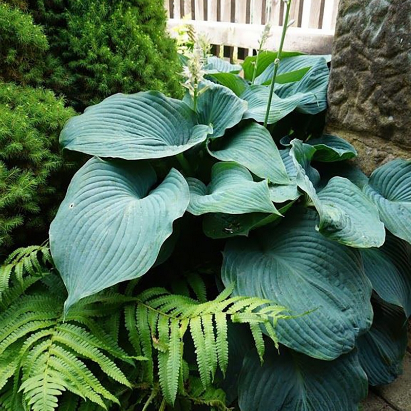 Хоста «Блю Энджел» - это крупный и эффектный сорт хосты, который выделяется своими массивными сине-зелеными листьями. Листья у этого сорта сердцевидной формы, с бархатистой текстурой и легким глянцем, достигают до 40 см в длину. Цвет листьев варьируется от насыщенного голубоватого оттенка до темно-зеленого, в зависимости от условий выращивания и освещенности. Этот сорт является одним из крупнейших среди хост, его высота может достигать 90 см, а диаметр куста - около 1,2 м. Цветет растение в середине лета, выпуская высокие цветоносы с белыми, крупными трубчатыми цветками, которые могут благоухать.