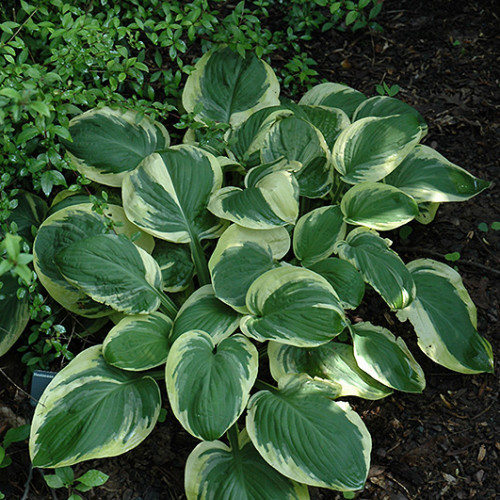 Хоста «Карнивал» - это яркий и декоративный сорт хосты, который привлекает внимание своими пестрыми, эффектными листьями. Листья этого сорта имеют уникальную окраску: центр листа ярко-зеленый или темно-зеленый, а широкая кайма кремово-желтая или золотистая. Форма листьев овальная, с легкой волнистостью по краям, что придает кусту дополнительную текстурность. Размер хосты варьируется от среднего до крупного, высота растения составляет около 45-60 см, в ширину куст может разрастаться до 80 см.