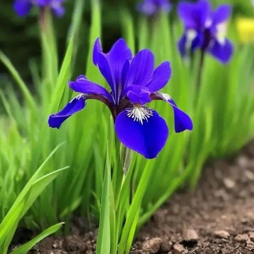 Ирис сибирский (Iris sibirica) — изящный и выносливый травянистый многолетник, который ценится за ажурную форму куста, обильное цветение и исключительную неприхотливость. Это растение образует плотные, живописные куртины из узких, линейных, насыщенно-зеленых листьев, которые сохраняют декоративность до глубокой осени и красиво колышутся при малейшем ветре. Высота цветоносов варьируется в зависимости от сорта от 60 до 120 см. Главная декоративная особенность ириса сибирского — многочисленные изящные цветки диаметром 6–10 см, расположенные на прочных, разветвленных стеблях. Лепестки нежные, часто с бархатистой текстурой, классической формы с отогнутыми вниз «фолами» (нижними лепестками) и поднятыми вверх «стандартами» (верхними лепестками). Окраска современных сортов включает белые, синие, фиолетовые, пурпурные, желтые оттенки и их комбинации, часто с контрастными жилками и пятнами. Цветение приходится на конец мая – июнь и длится 2–3 недели.