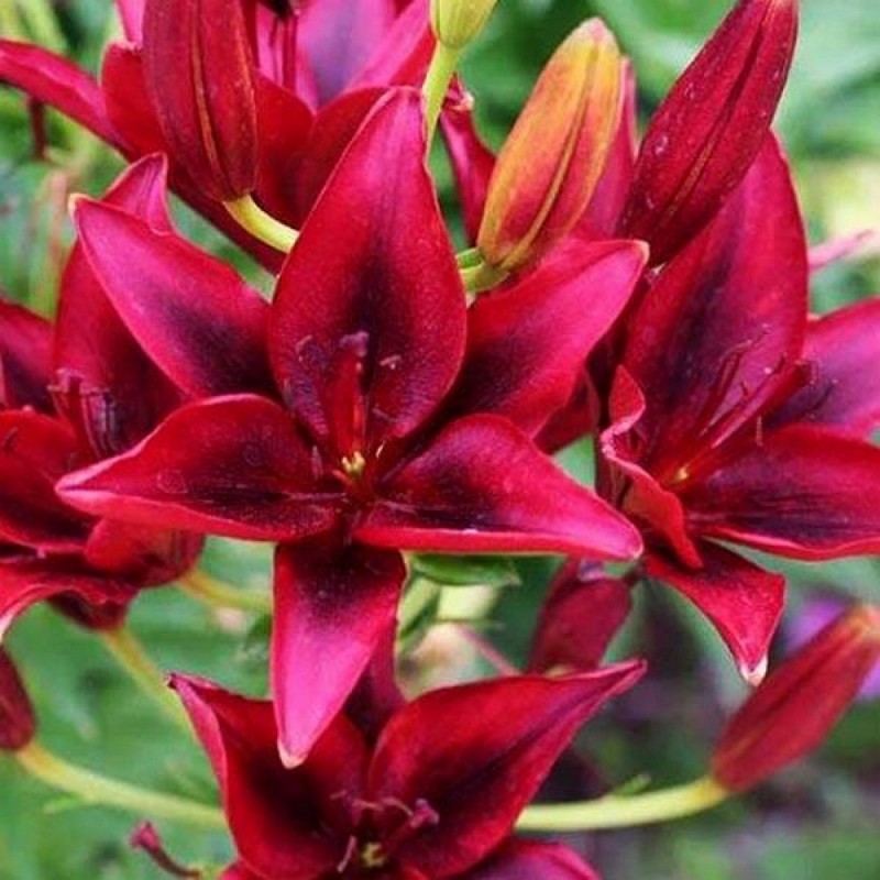 Лилия «Блэк Аут» (Lilium 'Black Out') - эффектный сорт лилии, который ценится за насыщенную темно-красную, почти черную окраску и крепкое строение цветка. Это многолетнее луковичное растение достигает высоты 90-130 см. Листья ланцетные, темно-зеленые с глянцевой поверхностью, длиной 12-15 см, создающие идеальный фон для выразительных цветков. Главная особенность сорта - крупные чашевидные цветки диаметром 17 см глубокого темно-красного цвета с бархатистыми лепестками и глянцевым отливом, создающим эффект «черного бархата». Цветение продолжительное, наступает в июле-августе и длится 2-3 недели.