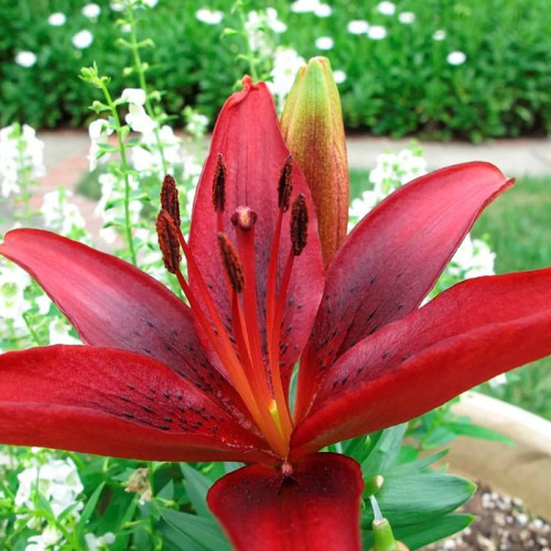Лилия «Блэк Аут» (Lilium 'Black Out') – эффектный сорт лилии, который ценится за насыщенную темно-красную, почти черную окраску и крепкое строение цветка. Это многолетнее луковичное растение достигает высоты 110-120 см с прочным темным стеблем. Листья ланцетные, темно-зеленые с глянцевой поверхностью, длиной 12-15 см, создающие идеальный фон для выразительных цветков. Главная особенность сорта – крупные чашевидные цветки диаметром 15-18 см глубокого темно-красного цвета с бархатистыми лепестками и глянцевым отливом, создающим эффект «черного бархата». Цветки собраны в кистевидные соцветия по 4-7 штук. Цветение продолжительное, наступает в июле-августе и длится 2-3 недели.
