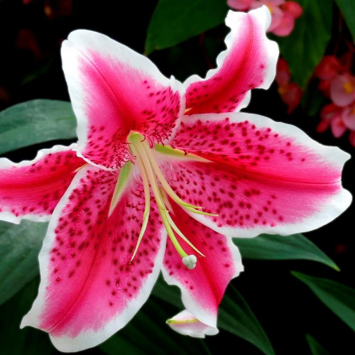 Лилия восточная «Старгейзер» (Lilium orientalis 'Stargazer') – популярный многолетний луковичный гибрид, который высоко ценится за экзотическую красоту цветков и интенсивный аромат. Это травянистое растение, достигающее в высоту 100-150 см, формирующее прочный прямостоячий стебель с темно-зелеными ланцетными листьями. Цветки крупные (диаметром 15-18 см), звездчатой формы, направленные вверх, с сильно загнутыми лепестками малиново-розового цвета с белой каймой и темно-красными крапинами. Аромат насыщенный, сладкий. Период цветения – июль-август, продолжительностью 2-3 недели.
