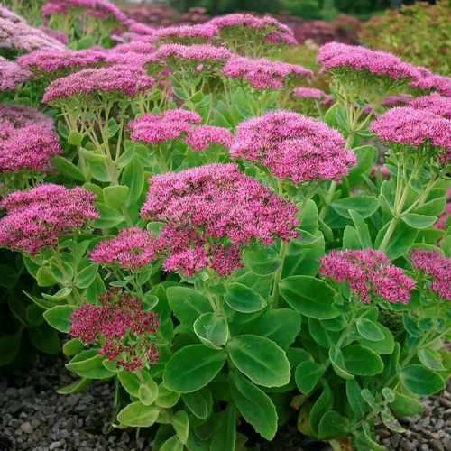 Очиток видный (Hylotelephium spectabile) – популярный многолетник, который ценится за позднее и продолжительное цветение, а также за исключительную неприхотливость. Это травянистое растение образует прямые, крепкие стебли высотой 30-50 см, формируя компактные кусты диаметром 30-50 см. Листья мясистые, овальные, светло-зеленые с сизым восковым налетом, расположены супротивно. Главная особенность вида – крупные щитковидные соцветия диаметром 10-15 см, состоящие из многочисленных мелких звездчатых цветков. Окраска варьируется в зависимости от сорта: от нежно-розовых и лососевых до насыщенных пурпурных и карминных оттенков. Цветение начинается в августе и продолжается до первых заморозков, привлекая в сад бабочек и пчел.