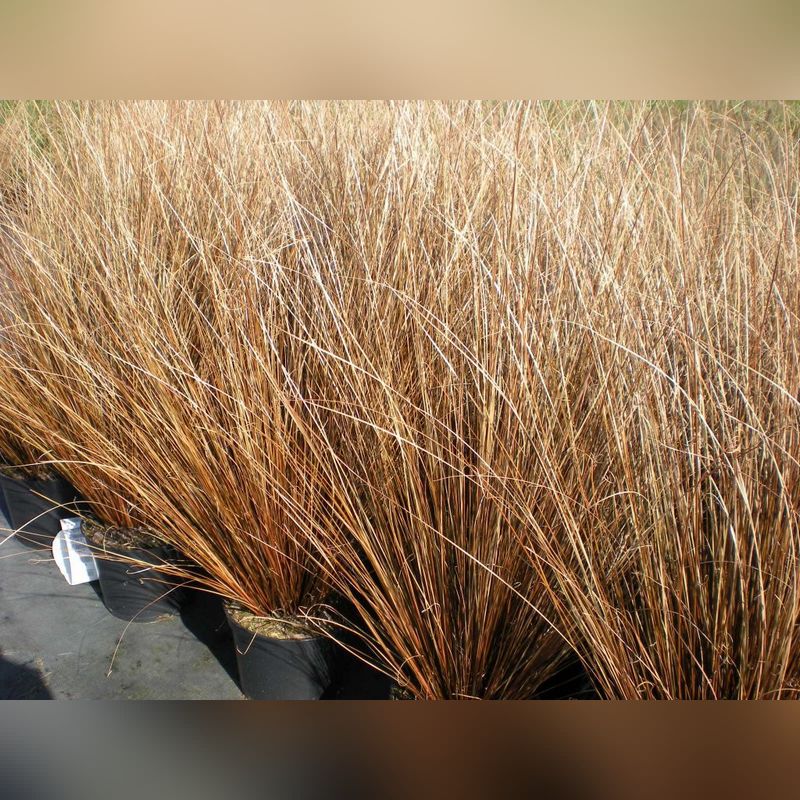Осока Буханана «Ред Рустер» (Carex buchananii Red Rooster) – декоративный злак с выразительной медной окраской и изящной архитектоникой, который ценится за цветовой акцент и текстуру в ландшафтных композициях. Это многолетнее травянистое растение образует плотные кочки высотой 50-70 см с диаметром куртины 30-50 см. Листья узкие, жесткие, цилиндрической формы, длиной 30-50 см, изящно изогнутые, сохраняющие декоративность круглый год. Молодые листья имеют медно-бронзовый оттенок, который с возрастом переходит в насыщенный рыжевато-коричневый цвет с металлическим отливом. Летом растение выпускает невзрачные колосовидные соцветия коричневого цвета, которые гармонично дополняют общую цветовую гамму.