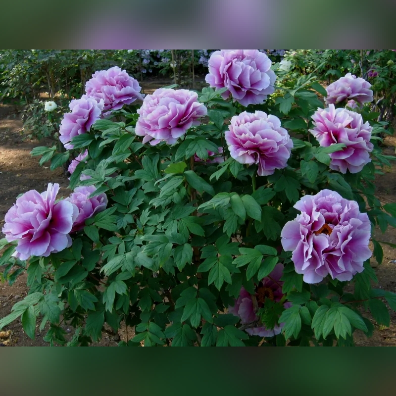Куст древовидного пиона достигает до 1,5-2 метров в высоту, образуя раскидистую и мощную крону. Листья у него крупные, сложные, тёмно-зелёного цвета, остаются декоративными на протяжении всего сезона. Цветы у древовидного пиона могут быть как простыми, так и махровыми, диаметром до 25 см. Они отличаются разнообразной палитрой цветов - от белого и розового до фиолетового и жёлтого. Цветение обычно происходит в мае - июне и длится около 2-3 недель. Цветы источают нежный аромат и часто украшают куст в изобилии.