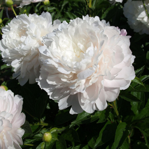 Растение достигает 90-100 см в высоту и формирует плотные, прямостоячие кусты с крепкими стеблями, которые хорошо поддерживают тяжёлые цветы. Листья у растения тёмно-зелёные, крупные, сохраняют декоративный вид на протяжении всего сезона. Цветы махровые, крупные, диаметром до 18-20 см. Лепестки имеют нежный розовый оттенок, который по краям светлеет до почти белого, что придаёт цветкам лёгкость и воздушность. Цветение начинается в конце мая - начале июня и продолжается около двух недель. Цветы обладают приятным, тонким ароматом, что делает их идеальными для создания букетов.