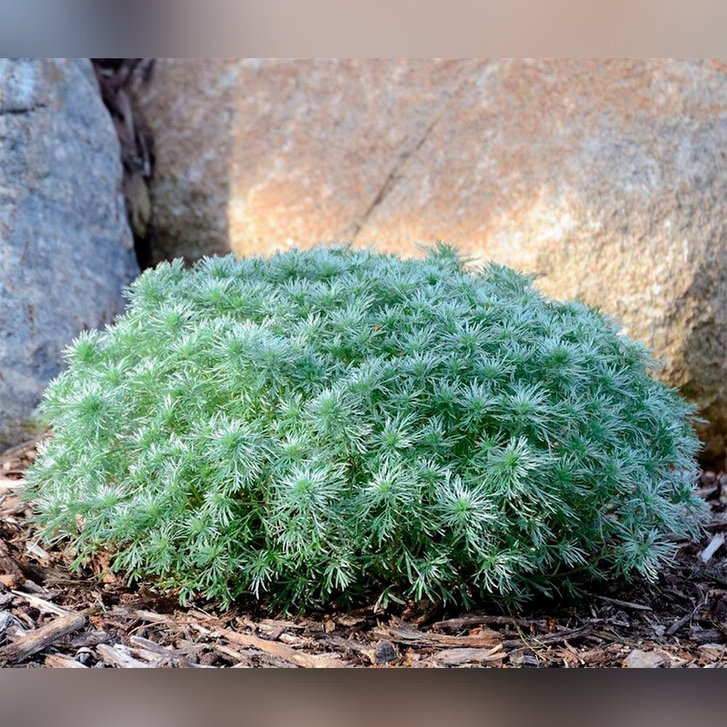 Полынь Шмидта «Нана» (Artemisia schmidtiana Nana) – изысканный многолетник, который ценится за ажурную серебристую листву и идеальную шаровидную форму. Это компактное растение образует плотные полушаровидные кустики высотой 20-40 см при диаметре куртины 30-40 см. Листья многократно рассеченные, нитевидные, покрытые густым серебристо-белым опушением, создающим эффект кружевного покрывала. Молодые листья имеют особенно яркий серебристый оттенок, который сохраняется в течение всего сезона. В августе появляются мелкие желтоватые цветочные корзинки, но основную декоративность растению придает именно листва.