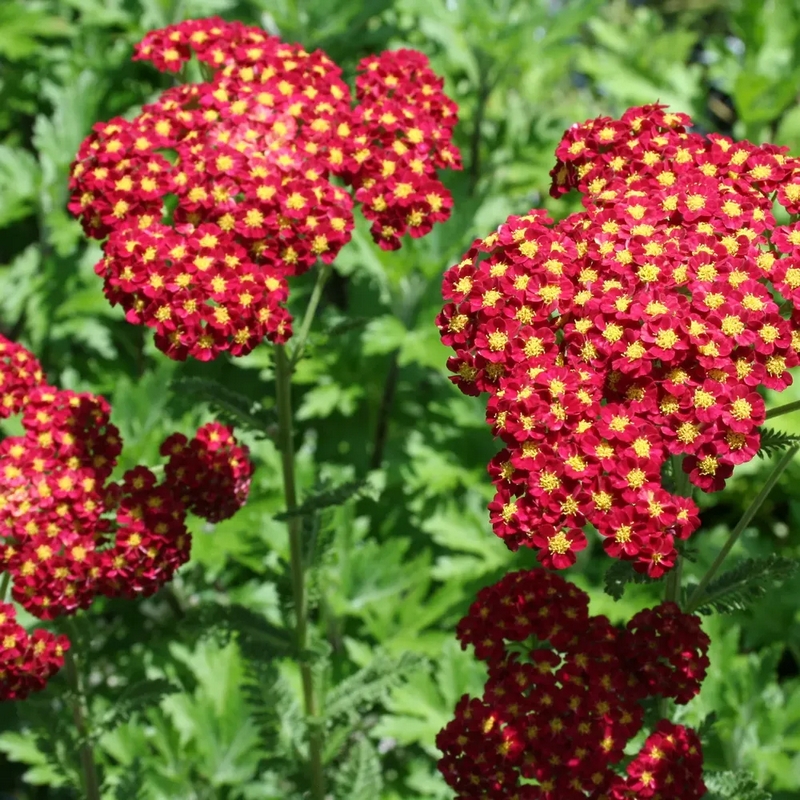Тысячелистник в ассортименте (Achillea) – коллекция популярных многолетников, которые ценятся за пышные соцветия-щитки, длительное цветение и неприхотливость. Эти растения образуют плотные куртины высотой от 20 до 60 см в зависимости от сорта, с ажурными перисто-рассеченными листьями. Листья зеленые или серебристо-серые, часто ароматные. Главная особенность коллекции – разнообразие окрасок соцветий: от классических белых и кремовых до солнечных желтых, нежных розовых, насыщенных вишневых и благородных лососевых оттенков. Мелкие цветки собраны в плотные щитковидные соцветия диаметром 5-15 см. Цветение продолжается с июня по сентябрь, при этом окраска соцветий интересно меняется по мере отцветания.