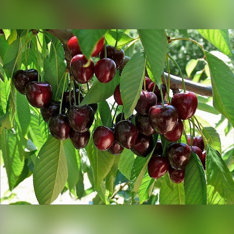 Черешня «Речица» - это среднеранний сорт, отличающийся хорошей зимостойкостью и устойчивостью к основным заболеваниям. Дерево среднерослое, достигает 3–3,5 м в высоту, с компактной, слегка приподнятой кроной пирамидальной формы, что делает его удобным для ухода и сбора урожая. Листья крупные, темно-зеленые, с заостренной верхушкой и мелкопильчатыми краями, характерные для черешни.