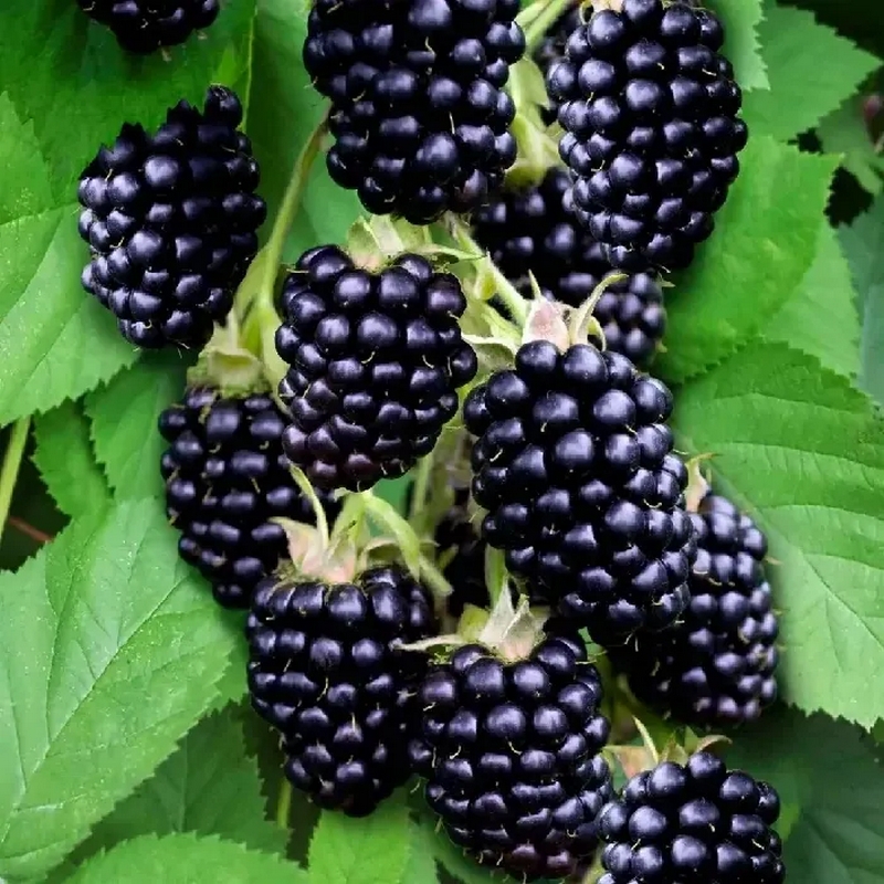 Ежевика «Кадо» – популярный бесшипный сорт ежевики, который высоко ценится за рекордную крупноплодность, превосходный вкус ягод и высокую продуктивность. Это мощный, энергичнорастущий кустарник с полустелющимися побегами, достигающий во взрослом состоянии высоты 2-2,5 м при длине плетей 3-4 м. Побеги полностью лишены шипов, что значительно упрощает уход и сбор урожая. Ягоды очень крупные (массой 7-9 г), удлиненно-конической формы, с глянцевой черной кожицей и плотной, но сочной мякотью. Вкус насыщенный, сладкий, с богатым ежевичным ароматом и легкой освежающей кислинкой.