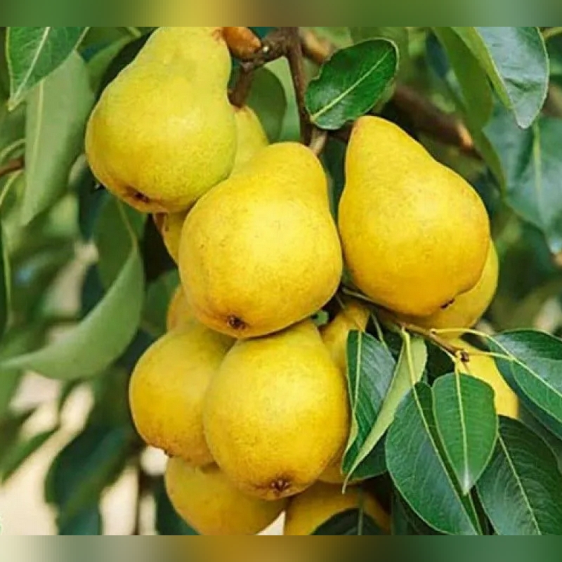 Груша колоновидная «Сапфира» - это компактное плодовое дерево узкой, вертикальной формы, практически без боковых разветвлений. Высота растения достигает примерно 2-2,5 м, а ширина редко превышает 50 см. Листья у сорта насыщенного зелёного цвета, блестящие и овальные, создающие густую декоративную крону. Плоды имеют продолговатую форму, гладкую кожуру с золотисто-желтым оттенком, иногда с легким румянцем. Масса одной груши достигает 150-200 граммов. Мякоть плодов кремового цвета, сочная и нежная, с приятным сладким вкусом и легкой медовой ноткой. Плоды созревают в сентябре. Дерево начинает плодоносить на 2-3 год после посадки.