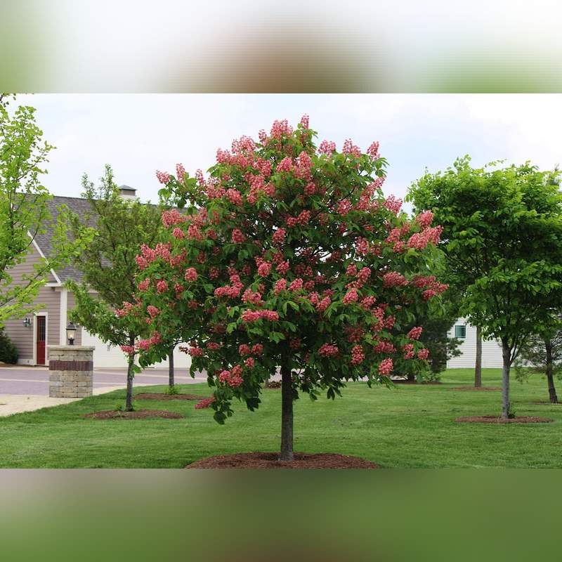 Каштан конский мясо-красный «Бриоти» - это гибридное декоративное дерево, которое отличается своими эффектными соцветиями и привлекательной кроной. Дерево достигает 15 м в высоту и формирует широкую, густую крону, диаметр которой может достигать 5-7 м. Листья у каштана «Бриоти» пальчатосложные, крупные, состоят из 5-7 лопастей, окрашенных в насыщенный тёмно-зелёный цвет. Осенью листья приобретают золотисто-жёлтые оттенки. Цветение начинается в мае и продолжается около двух недель. В это время дерево покрывается крупными, вертикально стоящими соцветиями-«свечами», которые состоят из множества ярко-розовых цветков с жёлтыми или красными пятнами у основания лепестков. Соцветия могут достигать 20 см в длину и выглядят особенно эффектно на фоне зелёной листвы. Плоды каштана «Бриоти» - округлые коробочки с колючками, внутри которых находятся 1-2 семени. В отличие от дикого каштана, плоды этого сорта менее заметны и имеют ограниченное декоративное значение. Семена несъедобны, на вкус горькие и содержат токсичные вещества, что делает их непригодными для употребления в пищу.