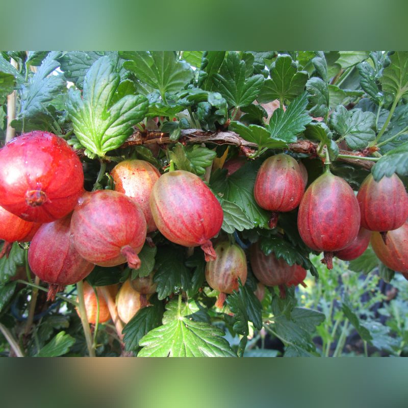 Крыжовник «Тиксия» – популярный среднепоздний сорт крыжовника, который высоко ценится за исключительно крупные ягоды и превосходные вкусовые качества. Это сильнорослый кустарник, достигающий во взрослом состоянии высоты 1,2-1,5 м при диаметре кроны 1-1,2 м, формируя умеренно раскидистую, компактную форму. Побеги практически бесшипные, что значительно облегчает уход и сбор урожая. Ягоды очень крупные (массой 7-9 г, отдельные до 13-15 г), округло-овальной формы, при полном созревании приобретают насыщенную ярко-красную окраску с легким восковым налетом. Мякоть сочная, нежная, сладкая с легкой освежающей кислотностью, десертного вкуса.