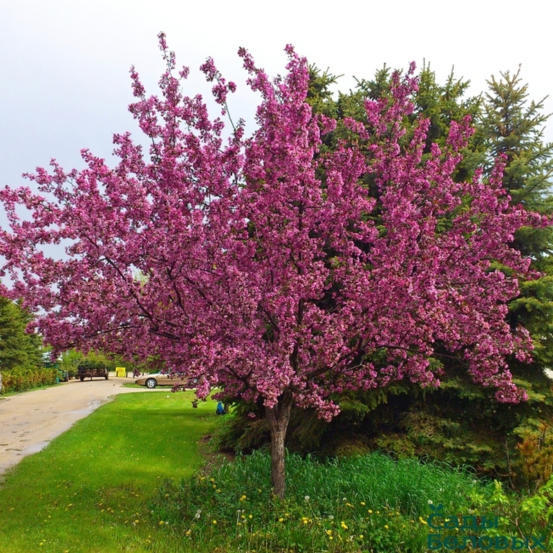 Декоративная яблоня «Хелена» - это привлекательное плодовое дерево, с насыщенными пурпурными цветами и бронзово-зелёной листвой, которое добавит яркости и разнообразия текстур в любой сад. Дерево обычно достигает 3-4 м в высоту, имеет узкую пирамидальную форму, что делает его компактным и удобным для использования на ограниченном пространстве. Весной оно покрывается крупными пурпурными цветами, которые привлекают внимание и создают контрастный фон для светлой зелени в саду.