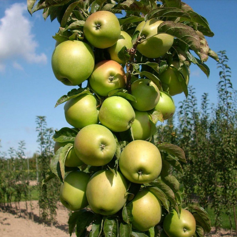 Плоды яблони среднего размера, округлые или слегка конической формы, с гладкой кожицей зелёного цвета, которая при полном созревании приобретает жёлто-зелёный оттенок. Мякоть плодов сочная, хрустящая, с приятным сладким вкусом и лёгкой кислинкой. Плоды созревают в сентябре, их можно собирать в начале осени. Яблоки хорошо хранятся до зимы и часто используются как для употребления в свежем виде, так и для приготовления варенья, компотов и соков.