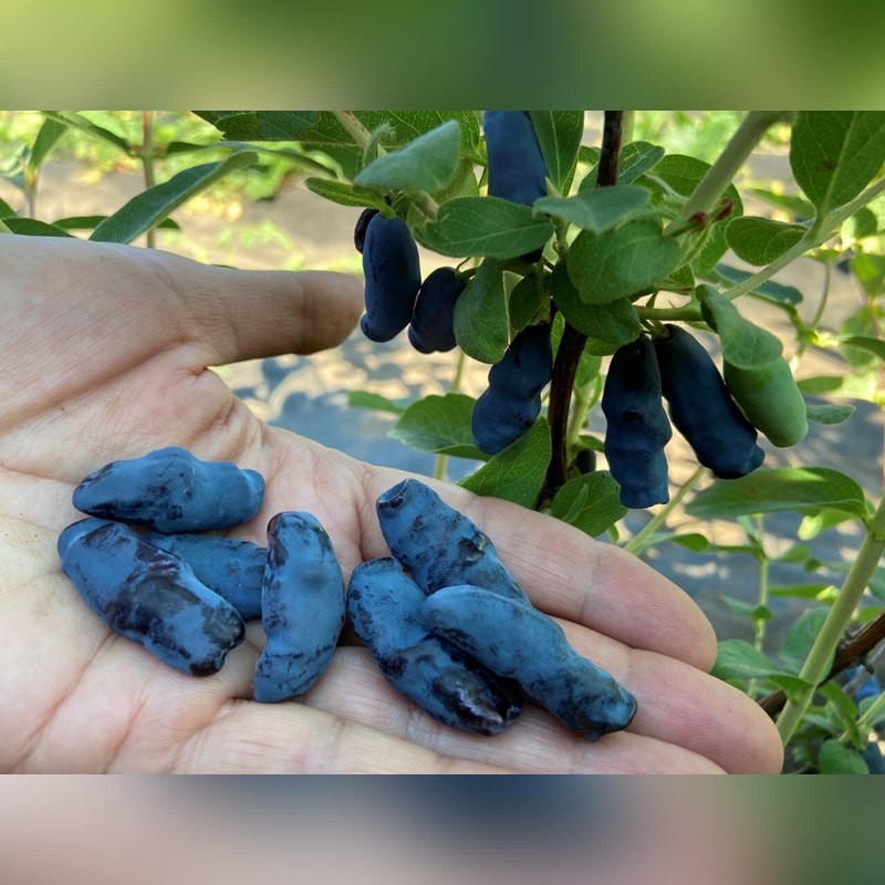 Жимолость «Бакчарский великан» - высокоурожайный, сильнорослый куст, достигающий около двух метров в высоту, с прочными прямостоячими побегами и густой кроной, украшенной тёмно-зелёными, слегка удлинёнными листьями. Плоды этого сорта весьма крупные, часто превышают длину в два-три сантиметра, имеют слегка удлинённую форму и окрашены в глубокий тёмно-синий цвет с нежным восковым налётом. Мякоть сочная, плотная, вкус гармонично сочетает сладость и едва уловимую кислинку, а аромат придаёт ягодам дополнительную привлекательность. Ягоды созревают рано, к середине июня уже можно приступать к сбору урожая, при этом желательно не затягивать со снятием плодов, чтобы не допустить их осыпания.