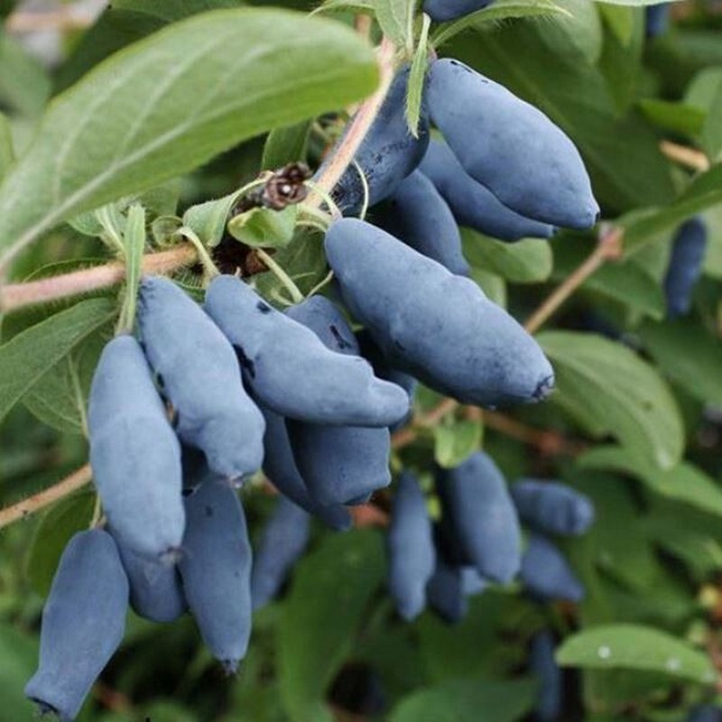 Жимолость «Голубой банан» – популярный раннеспелый сорт жимолости, который высоко ценится за обильное плодоношение, крупные ягоды и сбалансированный вкус. Это листопадный кустарник, достигающий во взрослом состоянии высоты 1,5-1,8 м при диаметре кроны 1,2-1,5 м, формируя плотную, округлую форму. Плоды очень крупные (длиной до 4 см), удлиненно-цилиндрические с характерным восковым налетом, придающим им насыщенный голубовато-сизый оттенок. Мякоть сочная, плотная, с приятным кисло-сладким вкусом и легким ароматом.